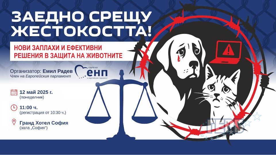 Международна конференция под надслов „Заедно срещу жестокостта! Нови заплахи и ефективни решения в защита на животните“ ще се проведе на 12 май (понеделник) от 11:00 ч. в зала „София“ на Гранд Хотел София. Форумът е организиран от българския евродепутат от ГЕРБ/ЕНП Емил Радев, зам.-председател на Интергрупата за защита на животните в Европейския парламент.
